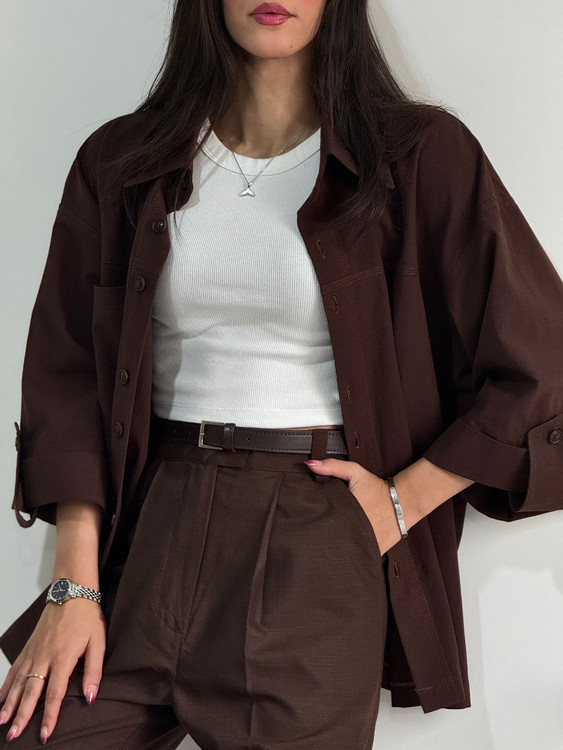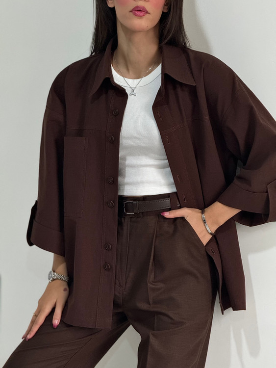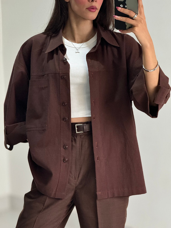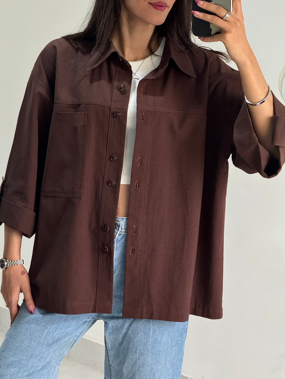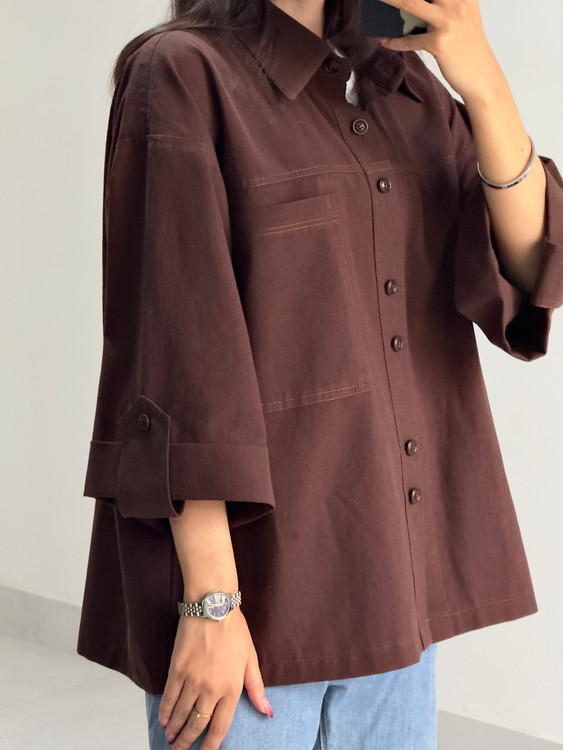 شومیز کوتاه لینن زنانه قهوهای سوخته