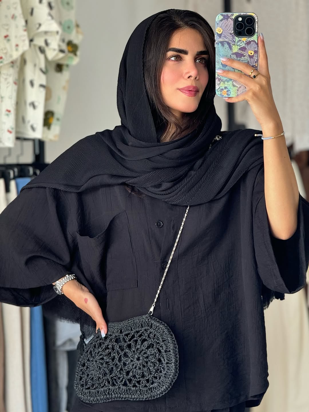 این ست مشکی، بسیار شیک و مینیمال است و برای استایلهای روزمره شیک، قرارهای دوستانه یا حتی محیطهای نیمهرسمی انتخاب عالی محسوب میشود. ترکیب با کیف دستبافت و کفش اسپرت سفید هم به استایل حس مدرن و امروزی داده است